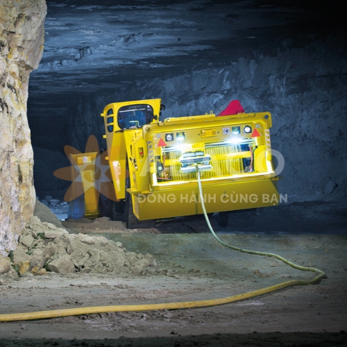 Máy ủi trong khu vực khai thác khoáng sản trong mỏ ngầm đang dùng dây cáp điện để duy trì nguồn cấp[/caption]