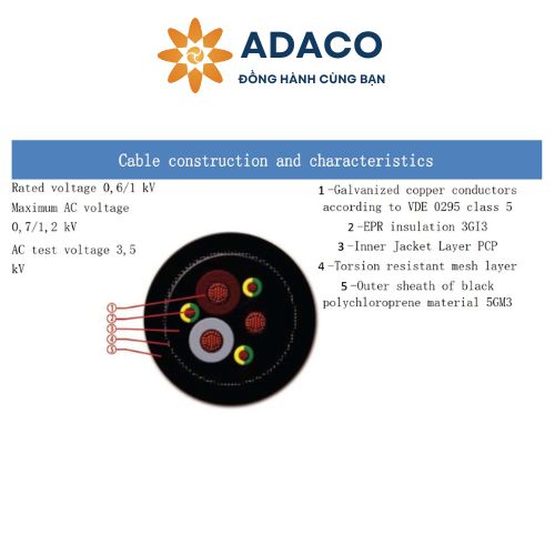 Diện áp định mức: Loại cáp cần cẩu này phù hợp cho các thiết bị sử dụng điện công suất cao (từ 0.6 đến 1kV).