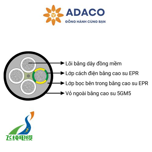 Cấu tạo của cáp bao gồm lõi dẫn điện bện mềm bằng đồng, cách điện bằng vật liệu chịu nhiệt, lớp bọc dẫn điện để giám sát tình trạng, và lớp vỏ bảo vệ bên ngoài chịu được các điều kiện khắc nghiệt. Nhờ đó, cáp có khả năng chịu đựng nhiệt độ cao, độ ẩm, mài mòn và va đập, đáp ứng các yêu cầu an toàn và độ bền trong công nghiệp khai khoáng.