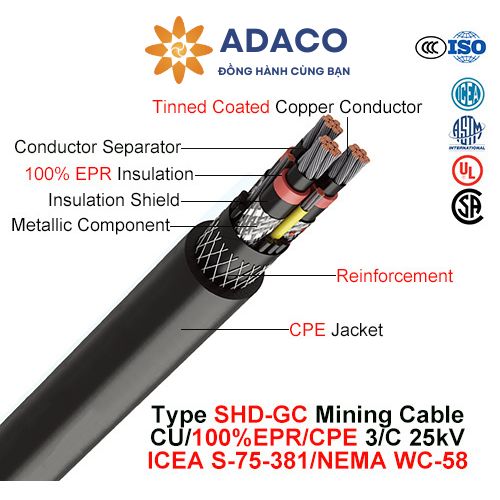 Hoạt động khai thác mỏ là một lĩnh vực công nghiệp đặc thù, đòi hỏi sử dụng những loại thiết bị chuyên dụng và có khả năng vận hành an toàn trong điều kiện khắc nghiệt. Trong số các thiết bị quan trọng này, cáp điện đóng vai trò thiết yếu, cung cấp nguồn điện cho các máy móc, thiết bị hoạt động tại khu vực khai thác mỏ. Cáp điện SHD-GC tròn 25kV vỏ CPE ba lõi dây là một trong những dòng sản phẩm cáp điện di động dùng cho các tác vụ kéo dây tiếp điện cho các thiết bị cơ động dùng trong khai mỏ, sản phẩm đáp ứng các tiêu chuẩn an toàn và kỹ thuật nghiêm ngặt của ngành công nghiệp cáp điện Bắc Mỹ và Canada, cáp được sản xuất bởi công ty cáp điện đặc biệt Feichun tại Trung Quốc và phân phối chính thức tại Việt Nam bởi nhà cung cấp ADACO. Cùng tìm hiểu về những tính năng vượt trội của dòng sản phẩm cáp điện phục vụ khai khoáng này trong bài viết dưới đây.