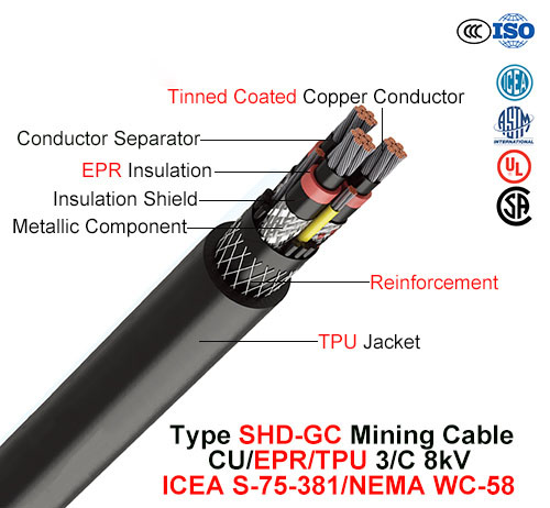 Là một sản phẩm đáng tin cậy và chất lượng cao trong lĩnh vực cáp điện phục vụ công nghiệp khai khoáng. Cáp điện di động SHD-GC cấu hình ngoài dây cáp tròn làm bằng vật liệu TPU, có ba lõi dây. Thiết kế của cáp đáp ứng sự khắc nghiệt của môi trường khai thác trong hầm lò, công trình ngầm và ứng dụng kéo dây cáp di chuyển cùng với các thiết bị cơ động trong hoạt động khai thác mỏ.