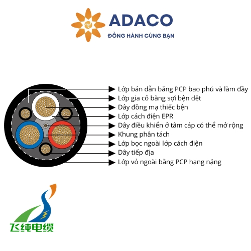 | Vỏ ngoài | Vỏ bọc bằng PCP hạng nặng. Lớp bọc CPE hoặc CSP hạng nặng cũng có thể được thiết kế thay thế theo yêu cầu. |