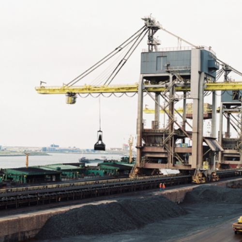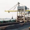 Cổng trục (có sử dụng cáp neo) xúc than từ xà lan lên tàu hỏa để vận chuyển tới khu vực xử lý